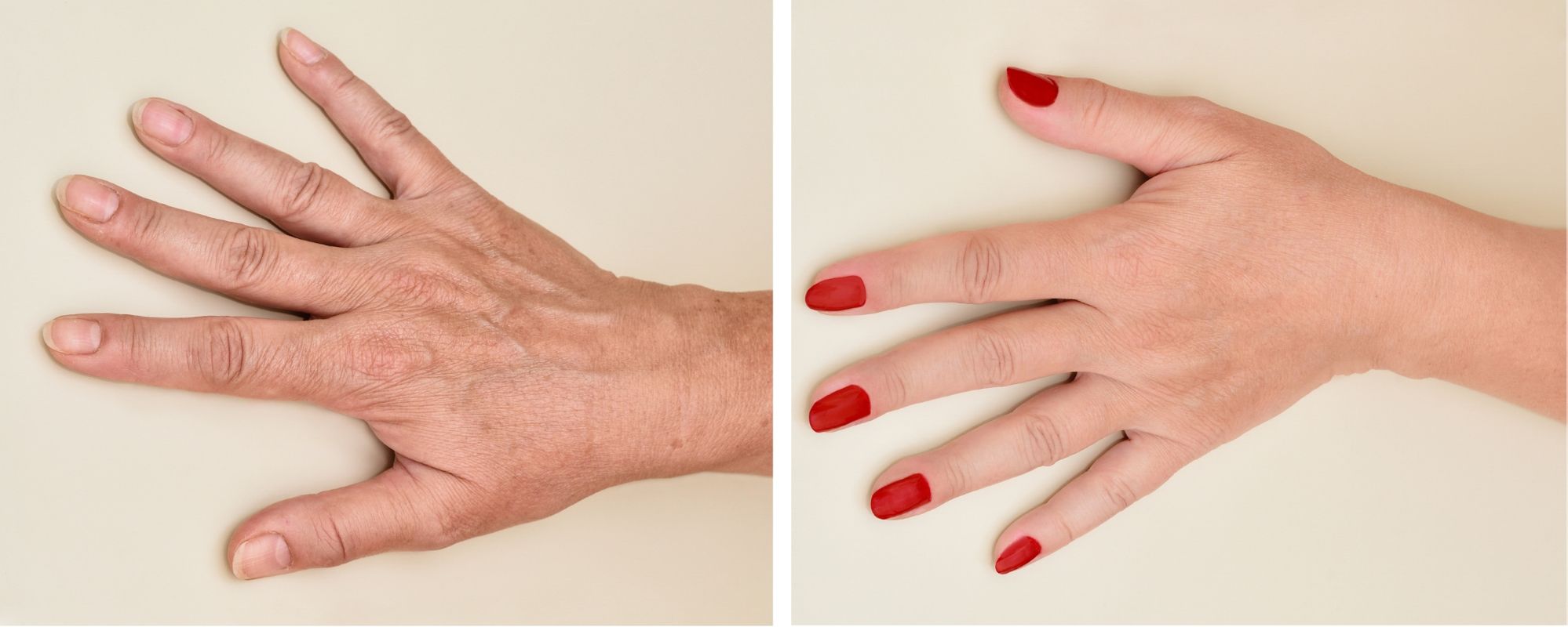 Sun-damaged, veiny, wrinkled hands can make you look older than you are. With age, the appearance of the hand changes due to both intrinsic and extrinsic factors. Extrinsic factors are exposure to the sun, chemicals and smoking. In contrast, intrinsic aging alters the deeper soft tissue planes, decreasing skin elasticity, soft tissue.